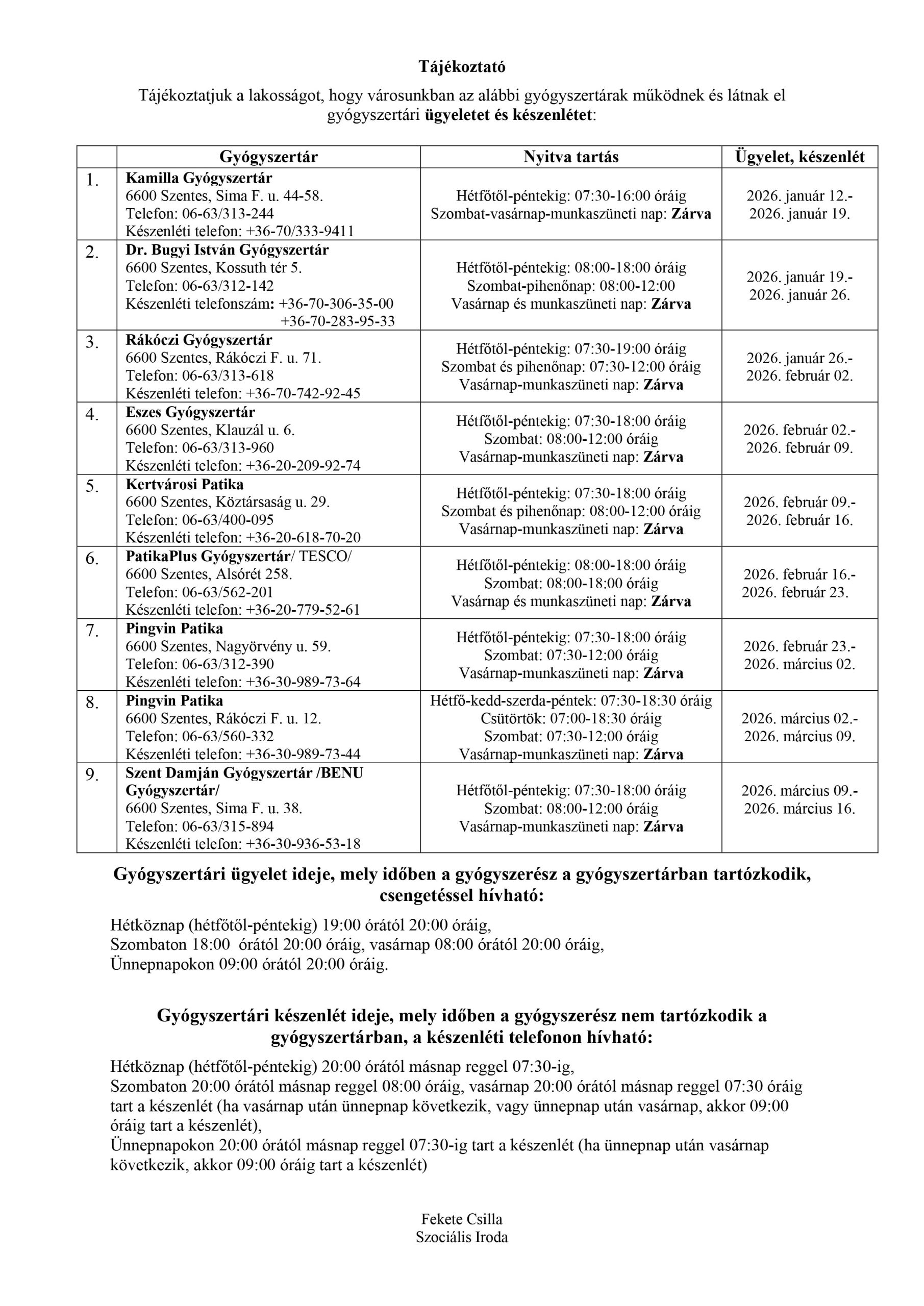 Gyógyszertári ügyelet 2026. január 12-től 2026. március 16-ig